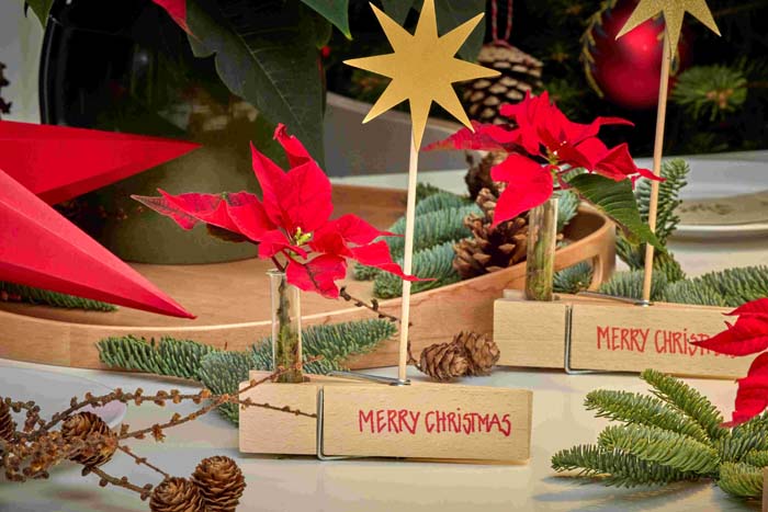 Αυτή η χειροποίητη δημιουργία από ξύλινα μανταλάκια, χρυσά χάρτινα αστέρια και κομμένα αλεξανδρινά σε δοκιμαστικούς σωλήνες αποτελεί μια γιορτινή εναλλακτική στα καρτελάκια θέσεων και σίγουρα θα ενθουσιάσει τους λάτρεις της παραδοσιακής χριστουγεννιάτικης διακόσμησης. Τα χειρόγραφα μηνύματα ή ονόματα πάνω στα μεγάλα μανταλάκια προσθέτουν μια προσωπική πινελιά σε κάθε θέση στο τραπέζι. Ο συνδυασμός φυσικών υλικών και γιορτινών χρωμάτων δημιουργεί μια ζεστή, φιλόξενη ατμόσφαιρα.